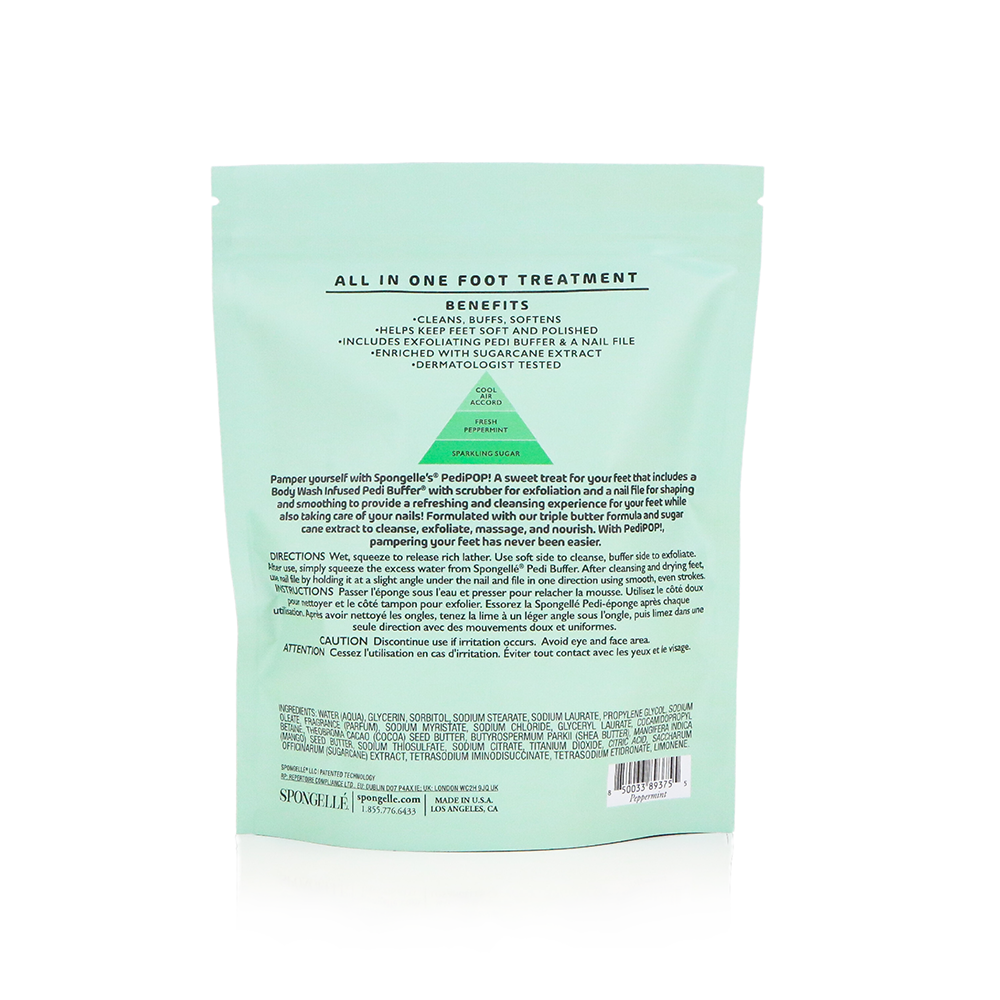 Pamper your feet with gentle cleansing exfoliation and convenient nail filling for expert grooming with our PediPop Body Wash Infused Pedi Buffer® in cooling Peppermint with refreshing mint and fragrant sparkling sugar. The unique popsicle-inspired combo makes shaping nails and soothing heels a refreshing experience with tender cleansing on one side and soft textured scrubbing on the other.